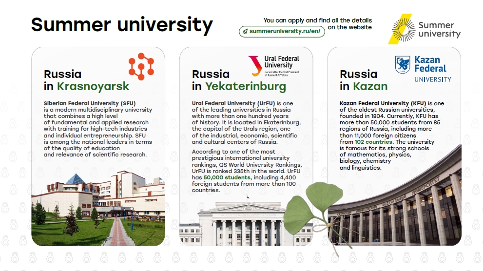 Открыта регистрация для участия в международном образовательном проекте «Летний университет». Проект предполагает ознакомительную поездку в Россию кандидатов из-за рубежа для участия в лекциях, семинарах и мастер-классах от ведущих преподавателей и индустриальных партнеров проекта по 21 профильному треку в областях инженерии, IT, гуманитарных дисциплин, биологии, психологии, экономики, энергетики и др. Программы реализуются на русском и английском языках.