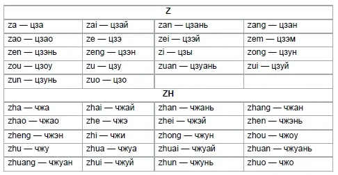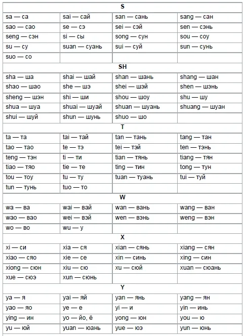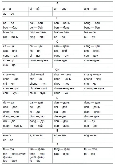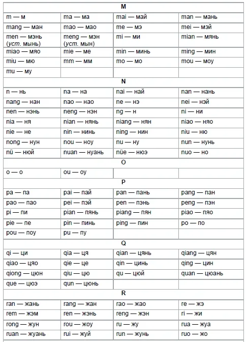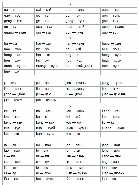 俄语转写可直接基于汉字书写形式进行,同时也可借助当前最通用的拉丁化拼音系统——汉语拼音作为中转进行转写。现附上汉语拼音与帕拉迪氏转写系统的音节对照转换表。