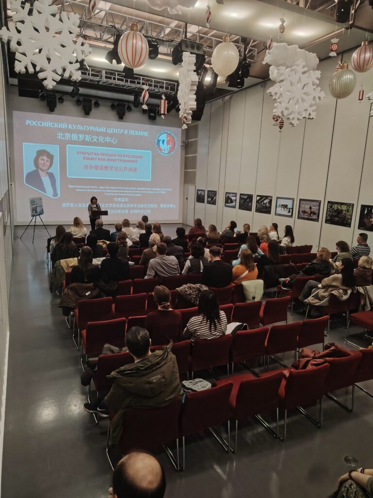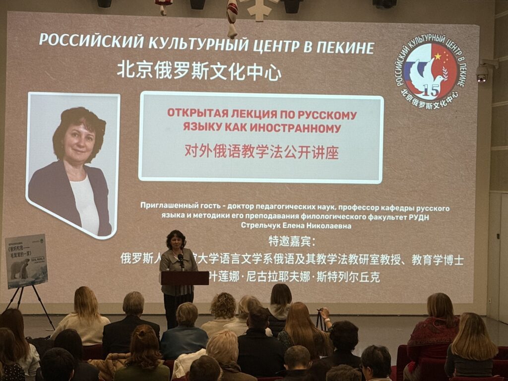 2025年11月28日,北京俄罗斯文化中心为俄语教学领域的专家学者举办了一场具有标志性意义的讲座。俄罗斯人民友谊大学俄语与俄语教学法系客座教授、著名专家叶莲娜·尼古拉耶夫娜·斯特列利丘克就主题“与普希金同行,向普希金迈进:俄语作为外语教学法新探” 作了报告。活动吸引了来自中国各地的50余位俄语教师参与,展现出大家对现代教学方法的浓厚兴趣。