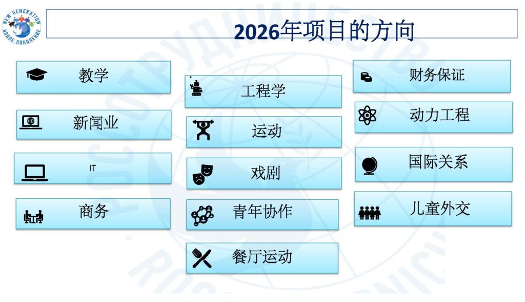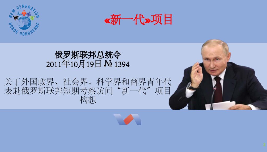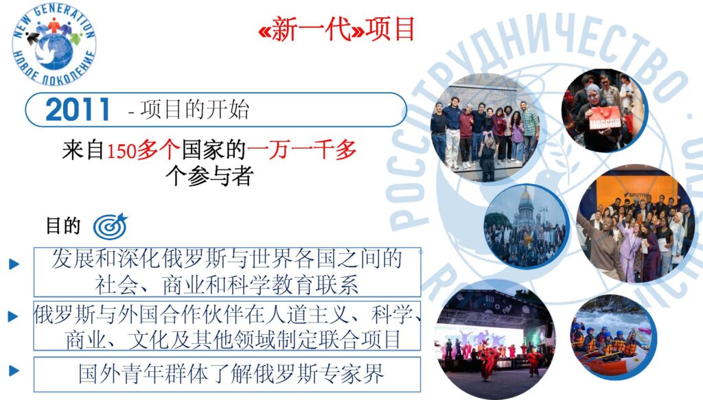 俄罗斯国际人文合作署将启动”新一代”项目招募工作。该项目组织各国政治、社会、科学及商界青年代表赴俄罗斯联邦进行短期考察访问。